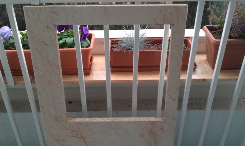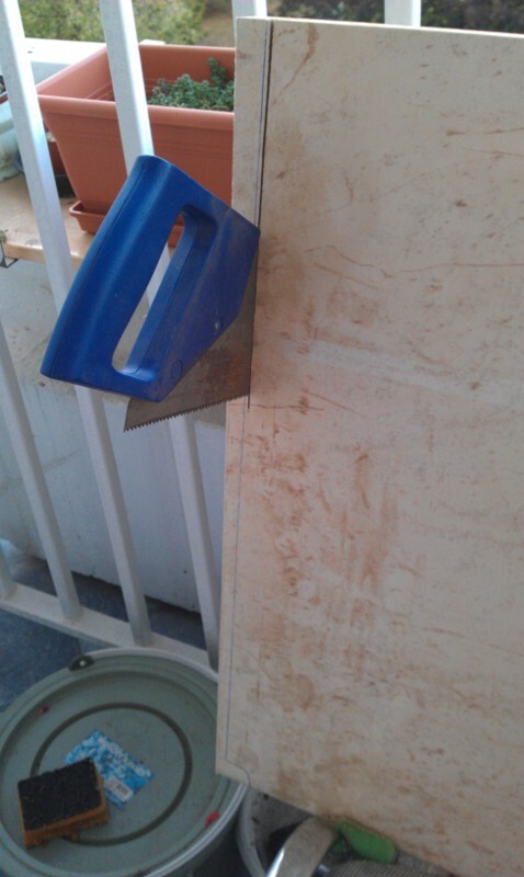 Az erkélyen két szék segítségével elkészül az ideiglenes fűrészbak.