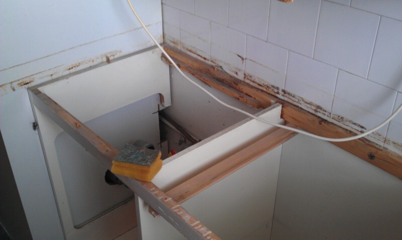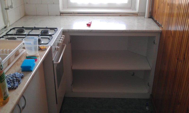 A mosogató szekrényen és szekrényben lévő cuccok eltávolítása, majd szekrénykén lévő ajtók eltávolítása.