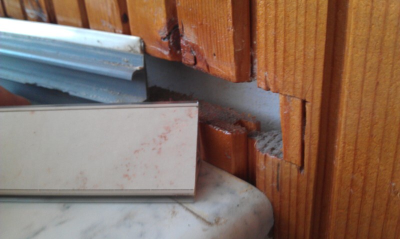 A vízzáról eltávolítása során nem várt meglepetés kerül napvilágra: a lambériában van egy kivágott rés, amelyet a régi vízzáró eltakart, az új viszont másfél centivel alacsonyabb, így nem tud takarni.