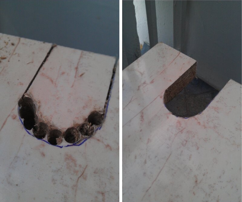 Az ablak mellett jobbra található a gázcső, amelyről leágazik a kályha felé egy vékonyabb cső, de ennek a függőleges csőnek a helyét ki kell vágni a munkalapból, hogy a helyére lehessen illeszteni. A kivágás a klasszikus “körbefúrom, majd ívesre ráspolyozom” mű előadásával történt.