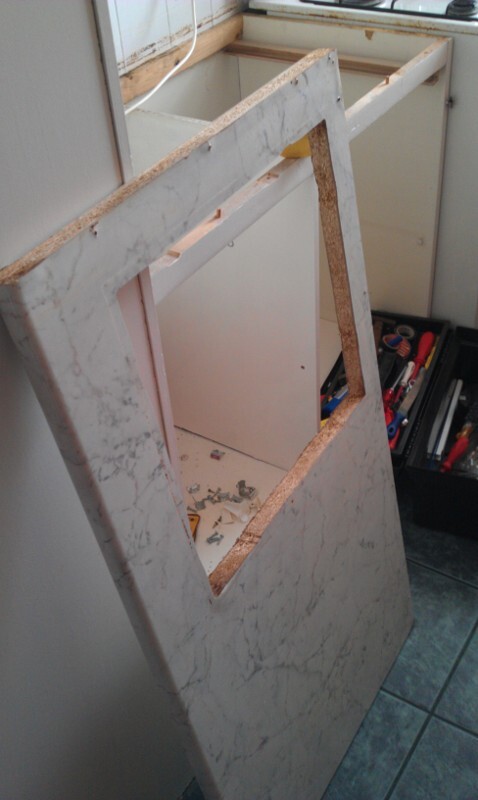 A régi – kissé megkopott, kissé megvetemedett – konyhapult lecserélése egy új – szintén pozdorja alapú – konyhapultra.