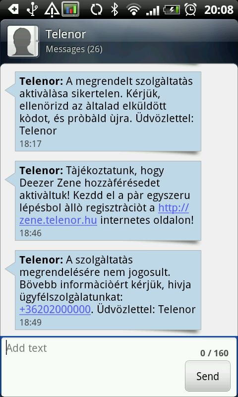 A szolgáltatásnak nyoma nincs a Telenor főoldalán, talán azért, mert még technikai problémákkal küzdenek, ugyanis a regisztráció nem volt zökkenőktől mentes, az elküldött SMS-re nem jött válasz, majd jött, több is: