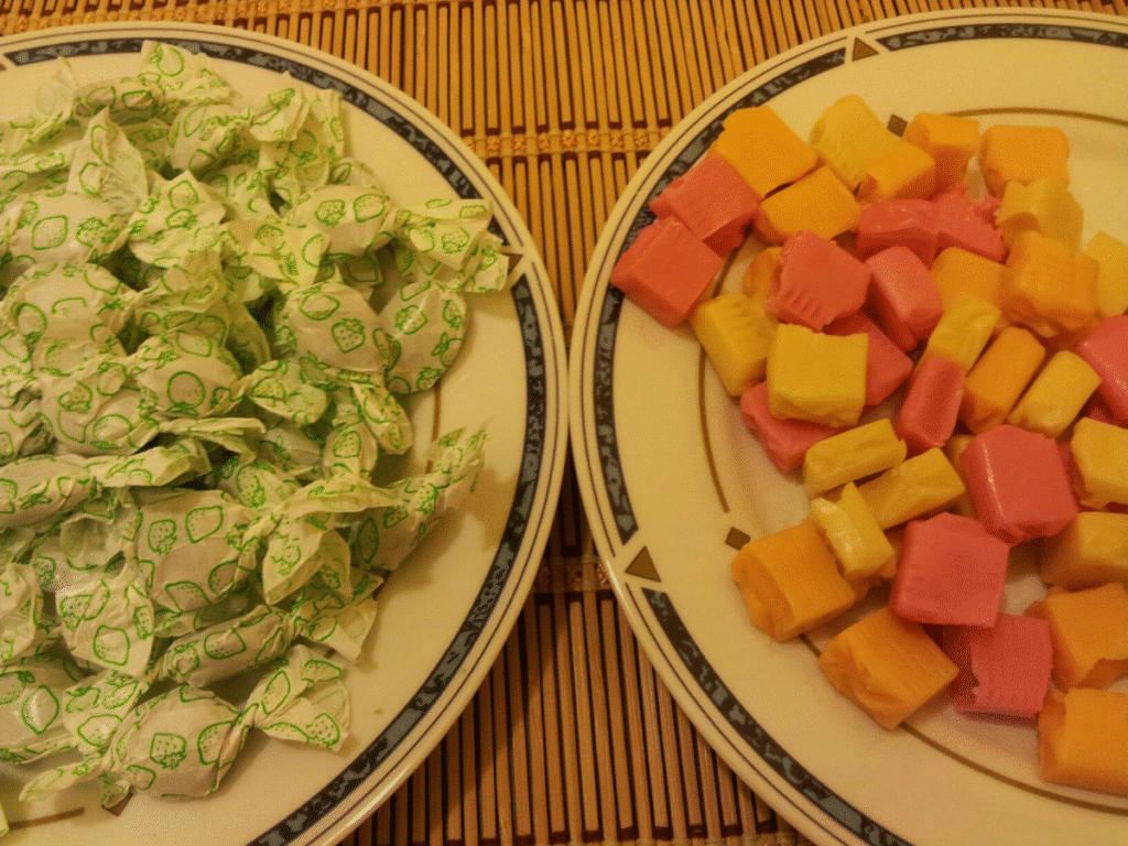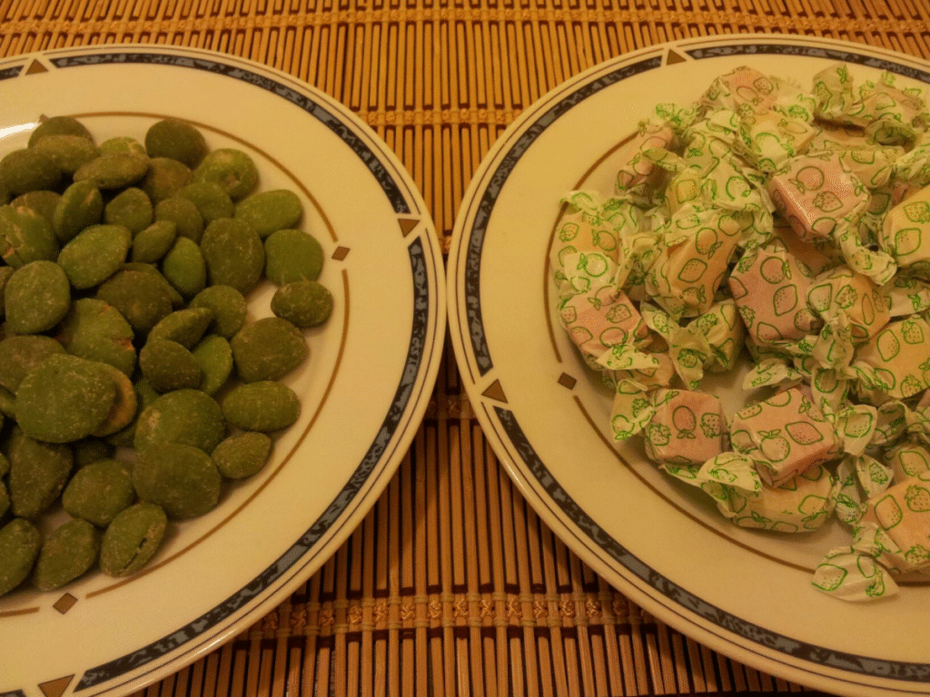 Az első képen zöld színben a wasabis mogyoró látható, amely erős rákészüléssel is kegyetlenül hat… hát még meglepetésszerűen gyümölcs ízű “kollégák kedvence” cukorka helyett… ugyanis minden egyes Frutti cukorka levetkőztetésre került, a ruhájukba pedig egy wasabis mogyoró helyezkedett el… a felöltöztetett wasabi pedig belekerül a Fruttis zacskókba… amelyekből holnap reggel látványosan átkerülnek majd a serlegbe. ![]()