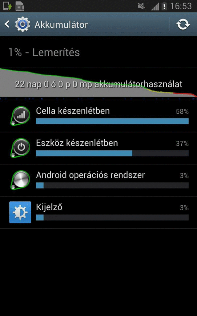 Nos… tegnap lemerült a Galaxy Note, 22 napot bírt egy feltöltéssel. Egy kicsit még húzhatta volna, de az utolsó 15 százalékról egy nap alatt merült le, talán az akkumulátor már használódott kicsit… 🙂