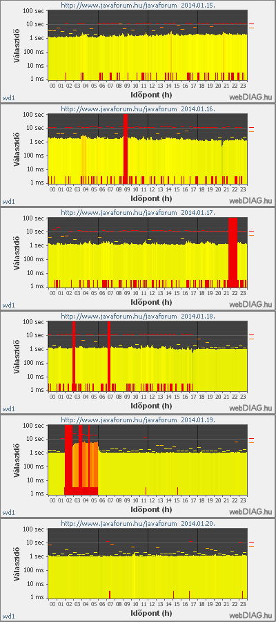 Az alábbi ábrán a Confluence netdiag.hu általi mérése látható, az új szerverre való átállás 18-án 17 órakor történt, jó látszik, hogy milyen néhány perces kiesések voltak, illetve előfordultak több tíz percig tartó lassulások (12 másodperc feletti válaszidő már szép piros színű). 19-én valószínűleg volt egy hálózati karbantartás (másodpercre pontosan éjjel kettő órától hajnali hat óráig tartott), amely az Integrity és a DigitalOcean között állt fenn, és jelentős lassulást okozott.