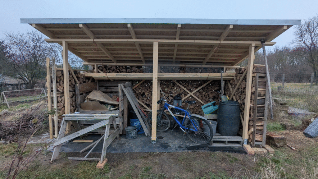 Pár hete felépült a kerti mindenes tároló, ahol a koncepció az volt, hogy majd jól körbe rakom tűzifával, és a tűzifa majd ott fog az eresz alatt száradni, mielőtt kenyérsütéshez vagy hobbi-fűtéshez felhasználom. Amíg pedig szárad, addig a száradáson kívül az esőtől védi a kerti mindenes tároló mindenét, a fának nem árt egy kis eső, mert hamar megszárad, a mindenféle cuccnak pedig szintén nem árt az eső, de azért jobb nekik, ha védve vannak az esőtől.